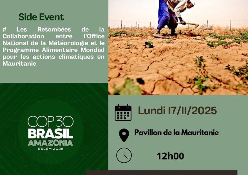 Présentation des acquis de la Collaboration entre L’Office National de la Météorologie (ONM) et le Programme Alimentaire Mondial (PAM) dans le cadre des Actions Anticipatoires, en Mauritanie à la COP30 le 17/11/2025 à 12h 00 à Belém